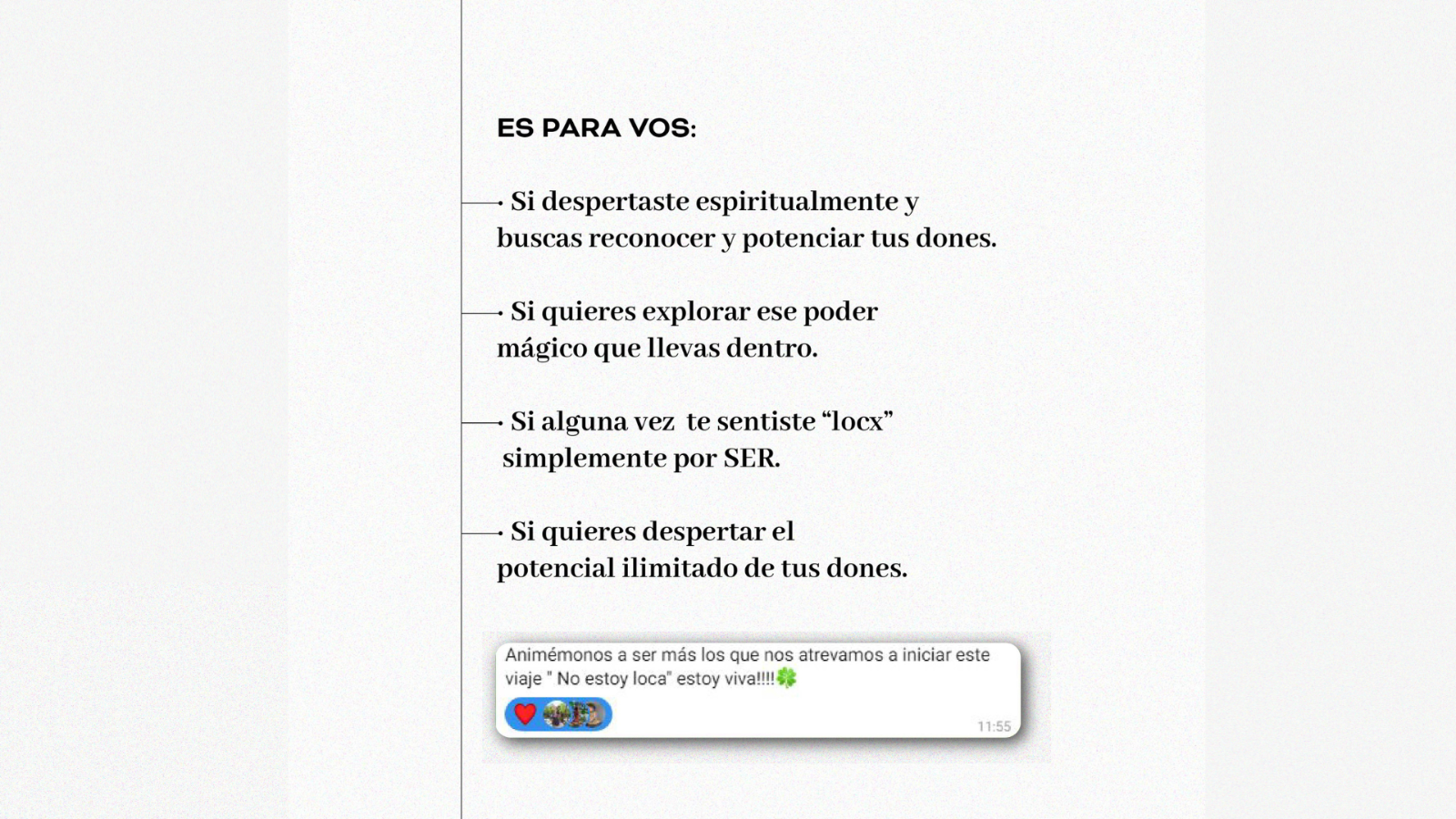 A abrazar tu magia sin pedir disculpas. basta de achicarte para encajar. Vas a entender cómo convertir eso que sentís y vivís en tu mayor fortaleza.